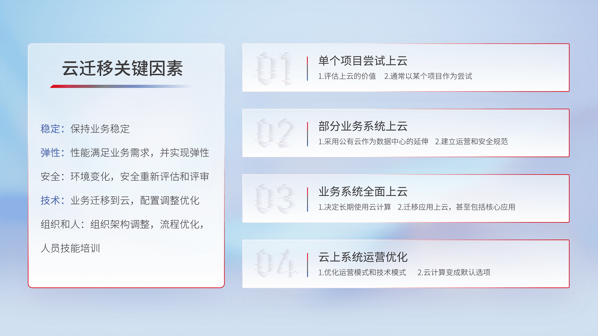 结合实际业务,,从规划设计、、、云平台选型、、、、云原生改造、、、、数据迁移、、、、集成交付,,,,迁移全过程为客户识别最佳上云路径,,,,做好风险识别管理,,,设计网络架构、、、身份权限、、、安全审计合规、、、操作审计、、、日志审计、、、、监控告警策略、、多站点容灾设计等,,对云上基础设施进行整体规划,,,提升IT治理水平,,以满足弹性、、、、高可用、、、高性能的需求。。。。