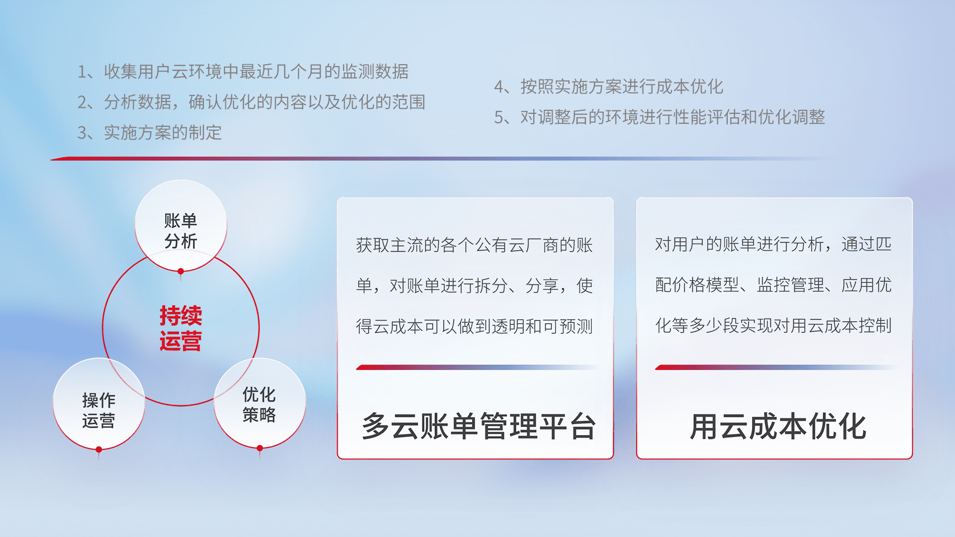 通过多云纳管,,,,以统一的资源数据模型把客户的云资源进行抽象和封装,,,,进而实现对多云资源的统一操作,,,保障云资源管理的可靠性、、稳定性与可用性。。。。量身定制化运维内容,,,配置、、、、开发运维、、、补丁管理、、、备份、、、、监控、、认证和访问管理、、审计和日常巡检等,,保障在用云过程中的可靠度,,,稳定度以及高可用率。。